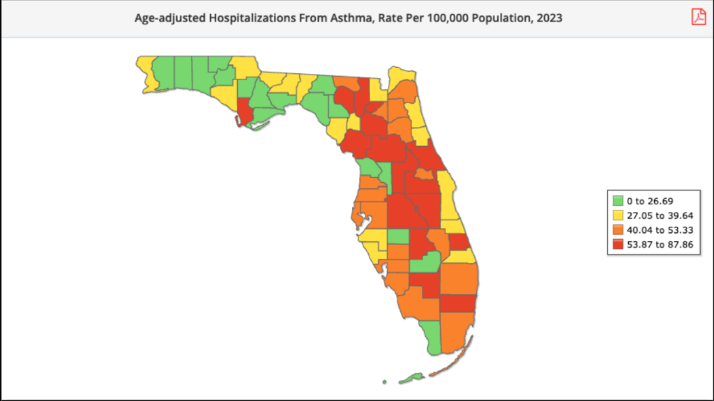 The influx of people, combined with a scarcity of pediatric pulmonology in the healthcare system, has made it difficult to provide adequate asthma care, contributing to the development of new hotspots in areas that previously had better coverage. Also, Florida’s rural areas, such as those in the Panhandle and parts of central Florida, often lack pediatric asthma specialists, and even primary care providers may be scarce, contributing to poorly managed asthma in children. In Florida, asthma impacts rural as well as urban communities. (Florida Asthma Coalition, 2023) (Florida Department of Health, 2023)